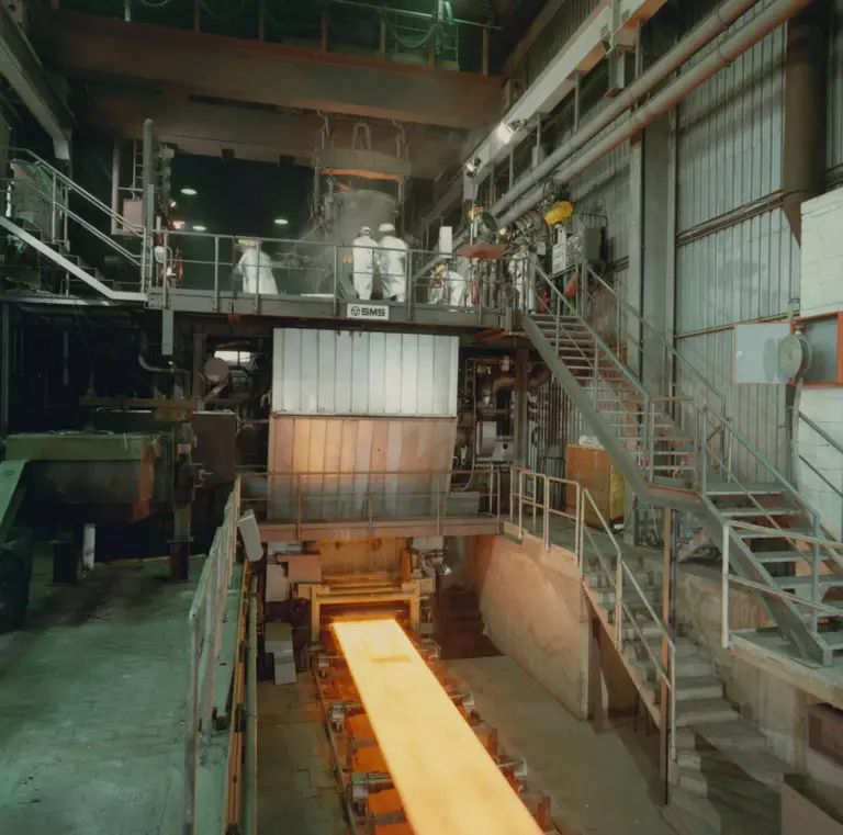 Im Sommer 1989 schreiben SMS und Nucor am Rand der amerikanischen Kleinstadt Crawfordsville inmitten von Maisfeldern Geschichte: Sie nehmen gemeinsam die erste Dünnbrammen-Gießwalzanlage in Betrieb. Die neu entwickelte trichterförmige Kupfer-Kokille und der optimierte Tauchausguss machen das „endabmessungsnahe Gießen von Brammen“ möglich. Die nur 50 mm dicken Brammen laufen durch einen kurzen Tunnelofen bevor sie in einer Fertigstraße direkt auf die Endabmessungen ausgewalzt werden. Das energieintensive Wiedererwärmen der Brammen und das Vorwalzen entfallen. Der Name der neuen Technologie: Compact Strip Production, kurz CSP®.