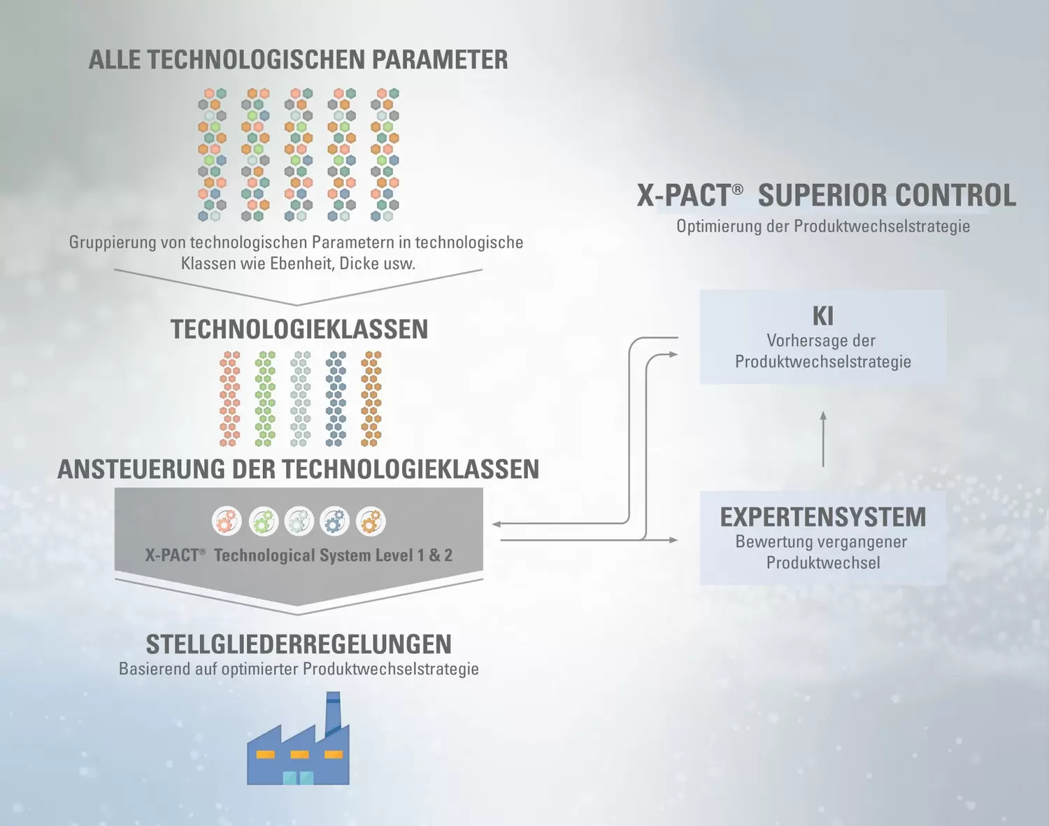 Auf diese Weise wird ein Expertensystem als Teil von X-Pact® Superior Control entwickelt, das im Nachgang für alle Produktwechsel automatisch die optimale Strategie berechnet, d. h. die optimale kombinierte Fahrweise aus den Technologieklassen wie Planheit, Dicke etc. Dieses Expertensystem liefert sogenannte „Lables“, Daten die für bereits durchgeführte Produktwechsel im Nachhinein die optimale Strategie anzeigen. Dieser Blick in die Vergangenheit kann nun basierend auf Massendaten beliebig oft durchgeführt werden. Somit werden im nächsten Schritt digitale KI-Systeme versorgt, die dazu dienen, eine Vorhersage für die optimale Produktwechselstrategie zu liefern.