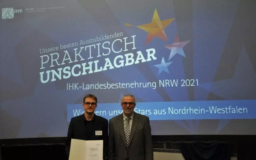 V.l.n.r.: Julian Streich, Landesbester als Fachkraft für Metalltechnik Fachrichtung Zerspanungstechnik mit Ausbilder für Zerspanungsmechaniker Bernard Hluchnik.