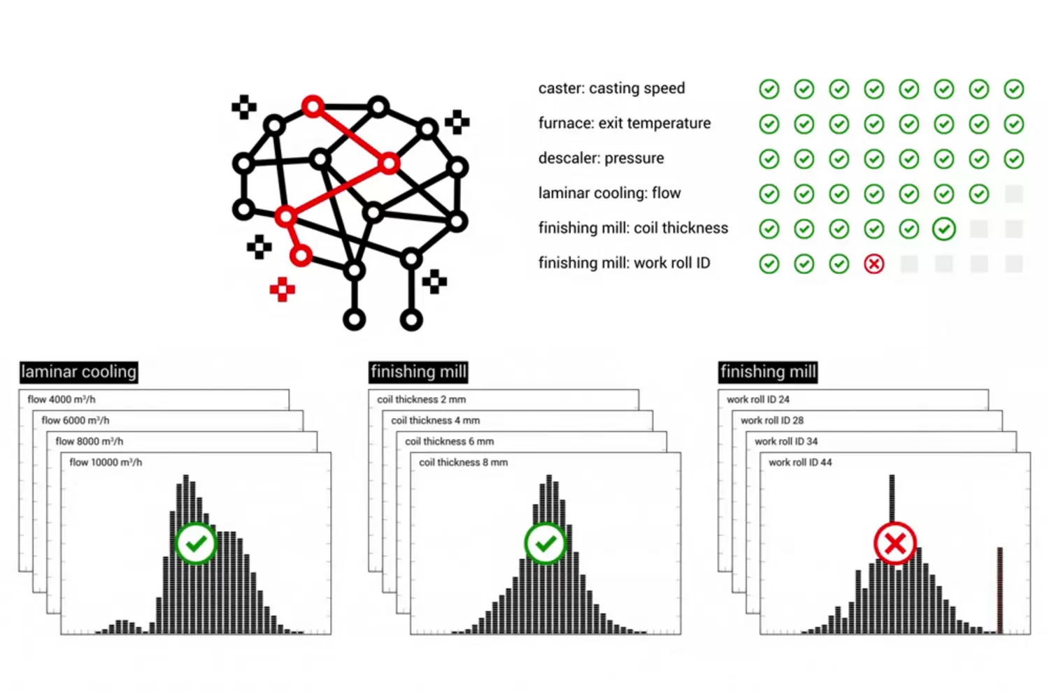 Mit der von der SMS group und der Jacobs Universität entwickelten X-Pact® Performance Enrichment Analysis – einer Methode mit künstlicher Intelligenz – kann der unerwartete Zusammenhang zwischen einer fehlerhaften Arbeitswalze in einem Walzgerüst und den Temperaturabweichungen in der Kühlung genau nachgewiesen werden und zwar deutlicher und effektiver als mit einer Standardanalyse. Ist das Performance Enrichment Analysis-Modul aktiv, lassen sich viele mögliche Fehlerfälle simultan überwachen.