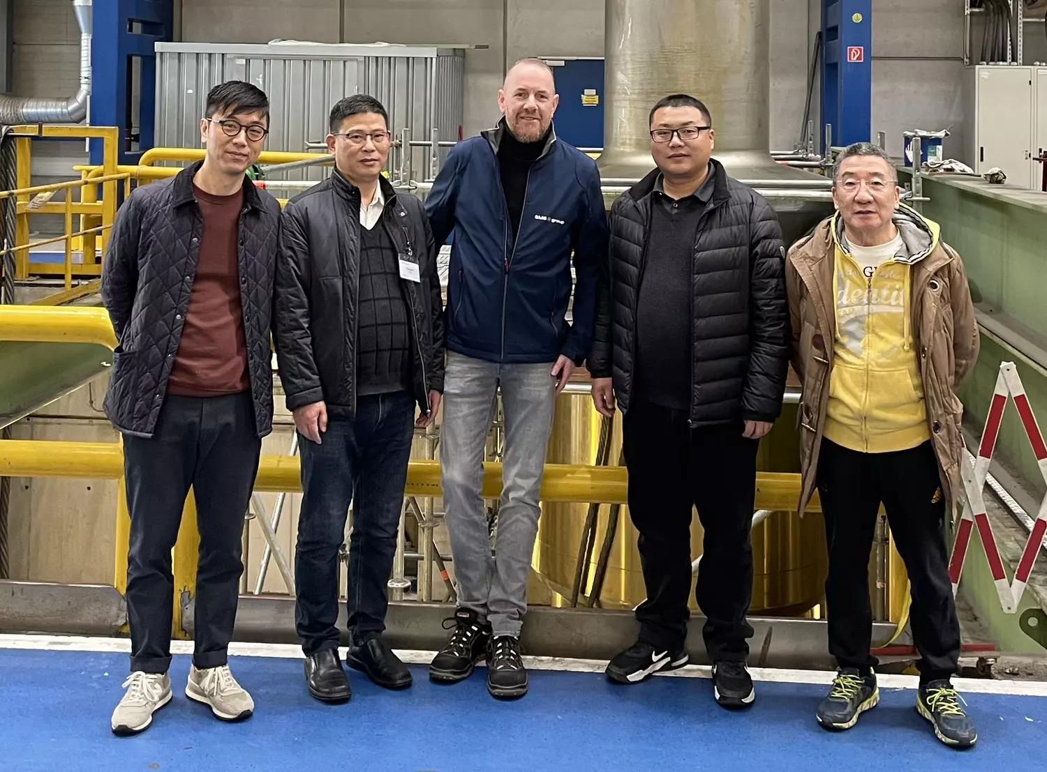 WTB delegation in SMS group workshop. From left to right: Mr. Zijia Guo (SMS Project Manager), Mr. Mo JianQiang – (Vice President of WTB) ; Lars Ziegenhagen (SMS Projektleiter); Mr.Li Xiang – (WTB Director of Equipment Dept.); Mr. Jin Zhe (SMS Agent - Beijing Joy Jinxiao International Trade Co., Ltd.)