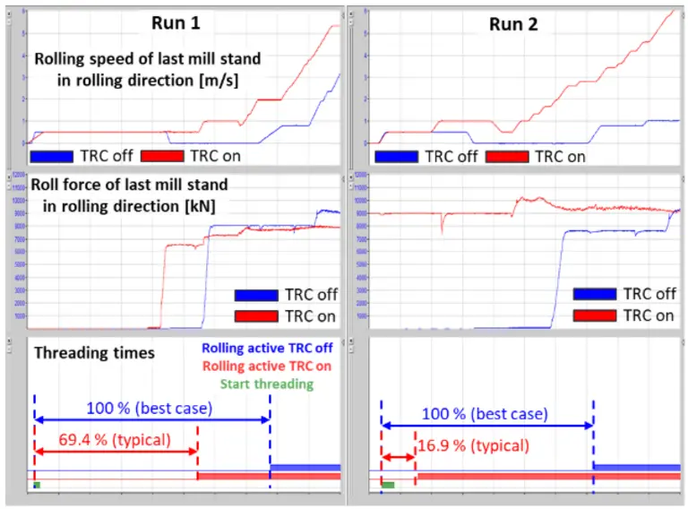 Example of threading time evaluation for beginning run1 (left side) and run2 (right side) for a 2-stand cold rolling mill