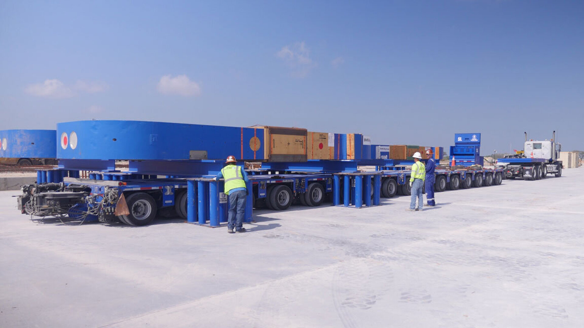 On board the deep-sea freighter BBC Destiny, the SMS group delivery reaches Corpus Christi, a port city in Texas on the Gulf of Mexico, by mid-May. The cargo comprise a total of six mill housings and 22 crates with a total weight of around 900 tons. Upon arrival in Texas, a distance of 50 kilometers has to be covered on land to the future production site in Sinton. Once more, this stretch is covered by a heavy-duty transporter.