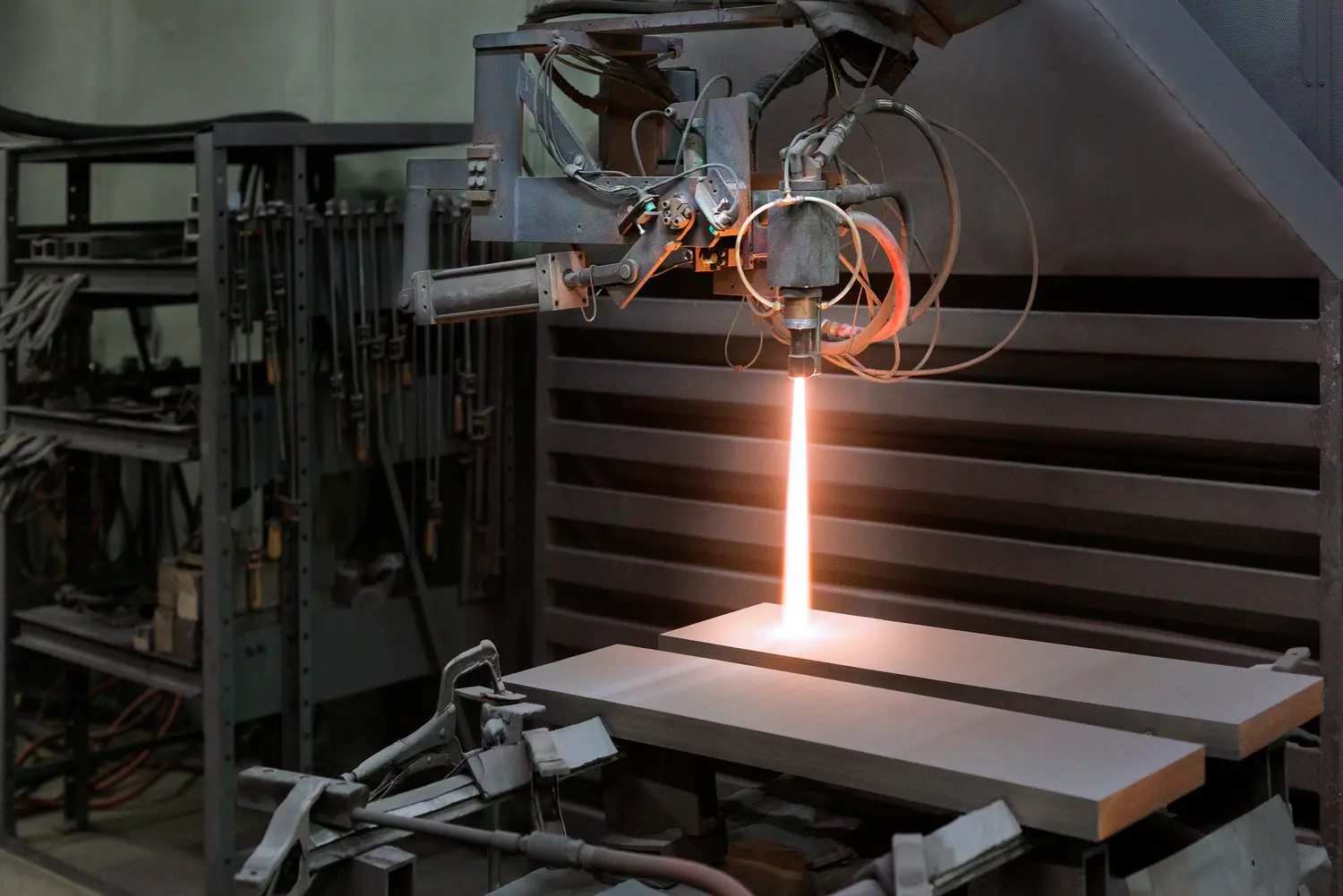 In the plasma spraying process, an electric arc is ignited between a water-cooled copper anode and a tungsten cathode via a high frequency discharge. The arc is sustained by a DC power source. A gas like Argon flows between the two cathodes and is ionized by the heat of the arc, leading to the formation of a very hot plasma gas stream. The plasma gas is expanding and accelerating through a nozzle. Powder is injected into this hot gas stream at the exit of the nozzle. The powder particles are usually fully molten and accelerated onto the substrate. Due to the absence of a shielding gas and the active atmosphere, powder particles oxidize before they hit the substrate. That is why Plasma Spraying is normally utilized for the processing of wear and corrosion resistant ceramics.