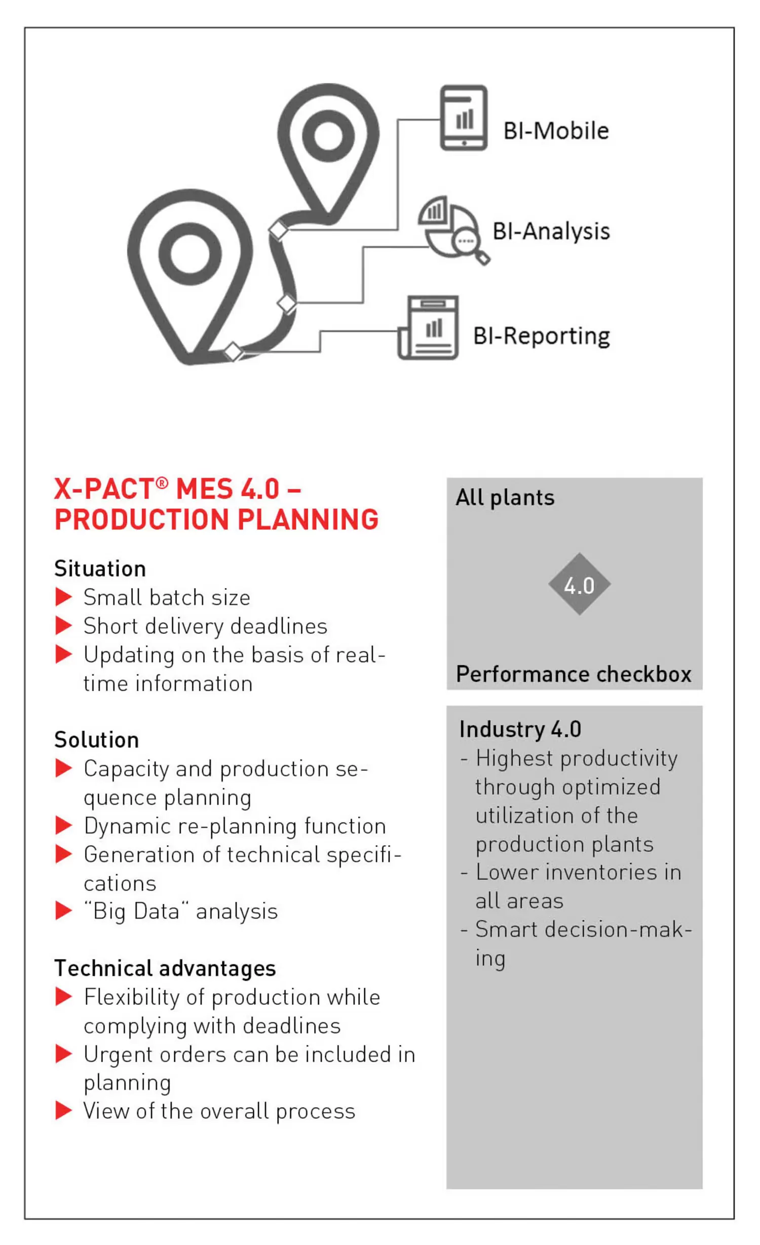 Today, Business Intelligence (BI) system with interactive analysis functions and comprehensive web reporting features is a core element of any modern planning system. It is able to map the production including consumed resources and use of equipment in great detail. This allows all relevant and detailed data to be made available at one central position for analysis purposes.