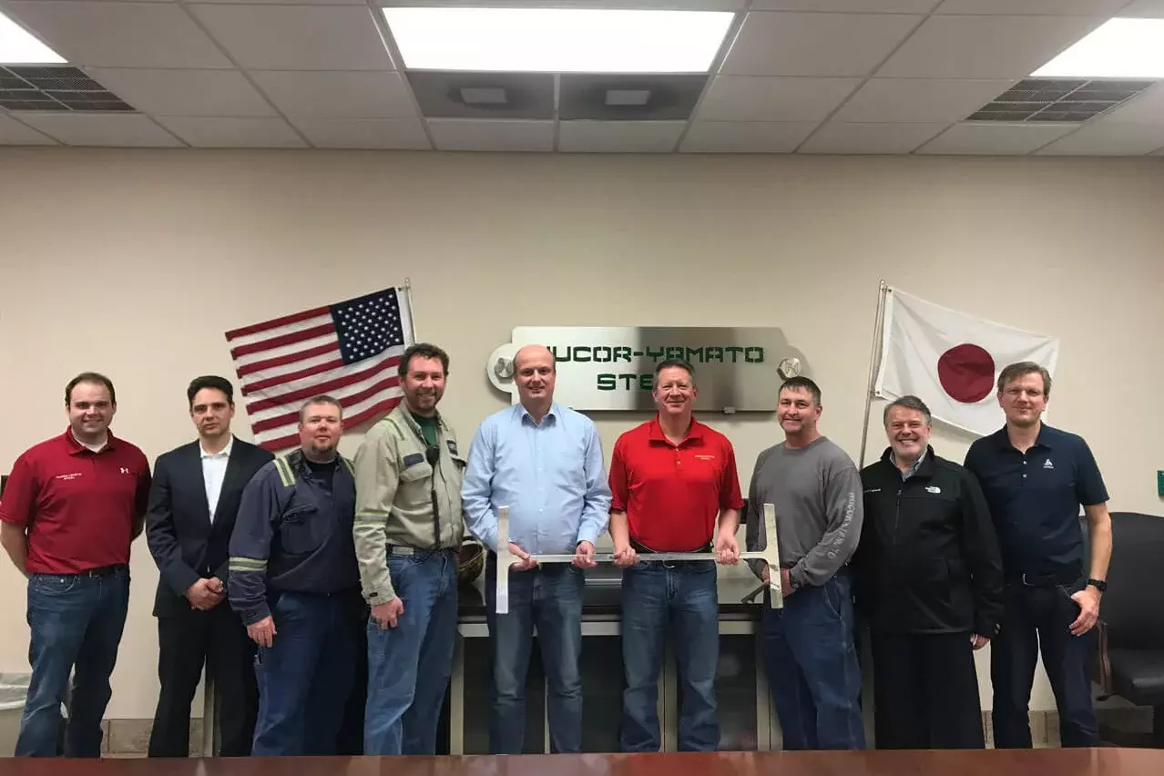 From left to right: Austin Pitzer, Controller, NYS; Waldemar Vogel, Sales Engineer, SMS group; Jason Ciepiela, Mill Maintenance Supervisor, NYS; Chris Ziegler, Roll Shop Supervisor, NYS; Thomas Maßmann, Vice President Section and Billet Mills, SMS group; Thad Solomon, Vice President and General Manager, NYS; Jim Shelton, Rolling Mill Manager, NYS; Mario Fabro, Long Product Sales Manager, SMS group and Dirk Köhler, E&A Process Engineer, SMS group.