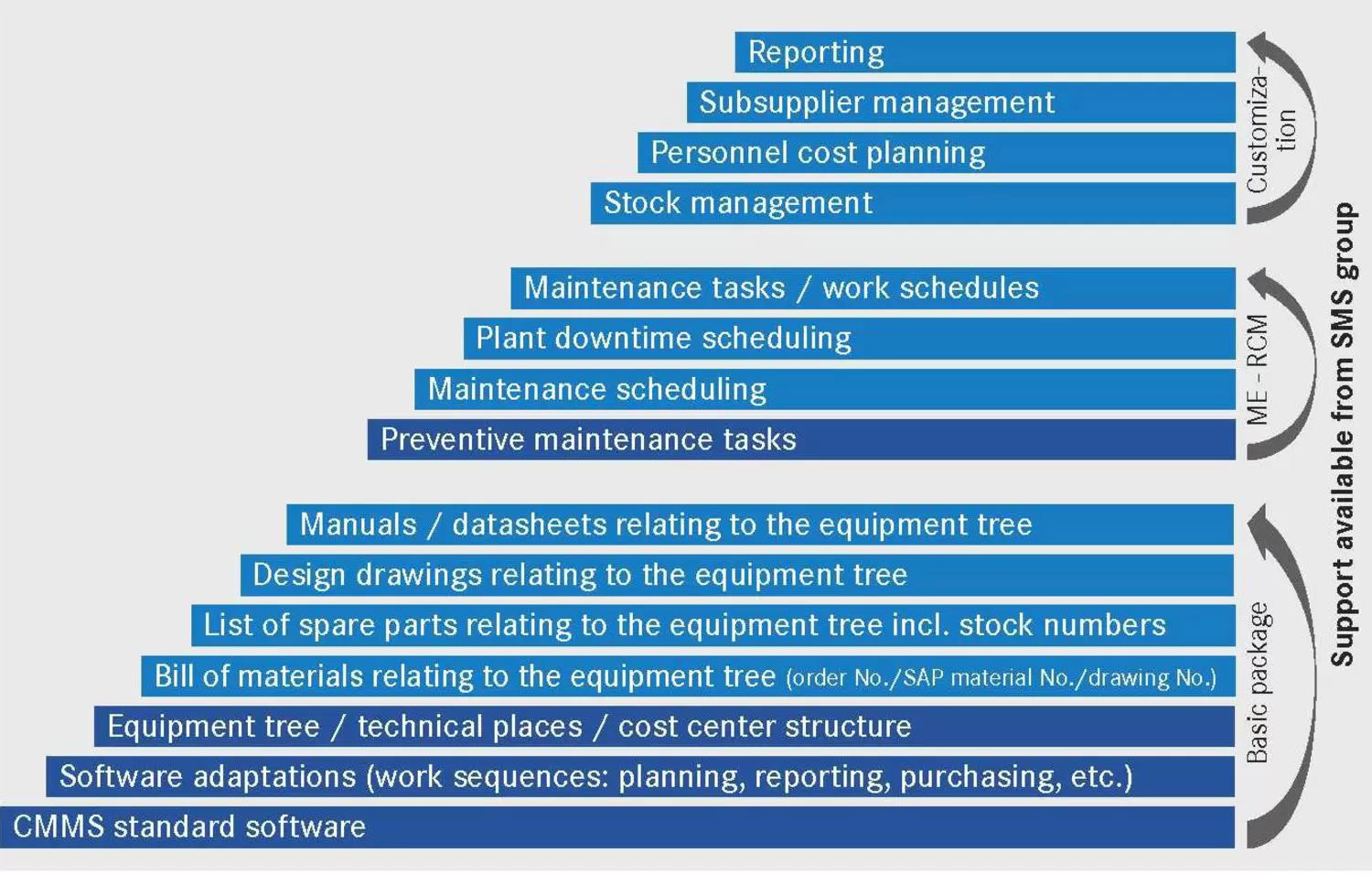 IMMS® supports the expansion of an effective servicing planning with the aim to optimize preventive maintenance ensuring plant availability and the quality of the end product in the long term. For that reason, a maintenance data package is supplied by SMS group. IMMS® is a combination of maintenance software (Computerized Maintenance Management System, CMMS) und valuable information based on experience in servicing for many decades. Here, the material flow of the complete plant is displayed except the functional locations and all technical parameters are incorporated to establish a reliable basis for effective servicing planning and organization. Each component to be maintained is clearly identified and coded in the plant tree and thus assures target- and purpose-oriented servicing ensuring an economical management of the complete plant.