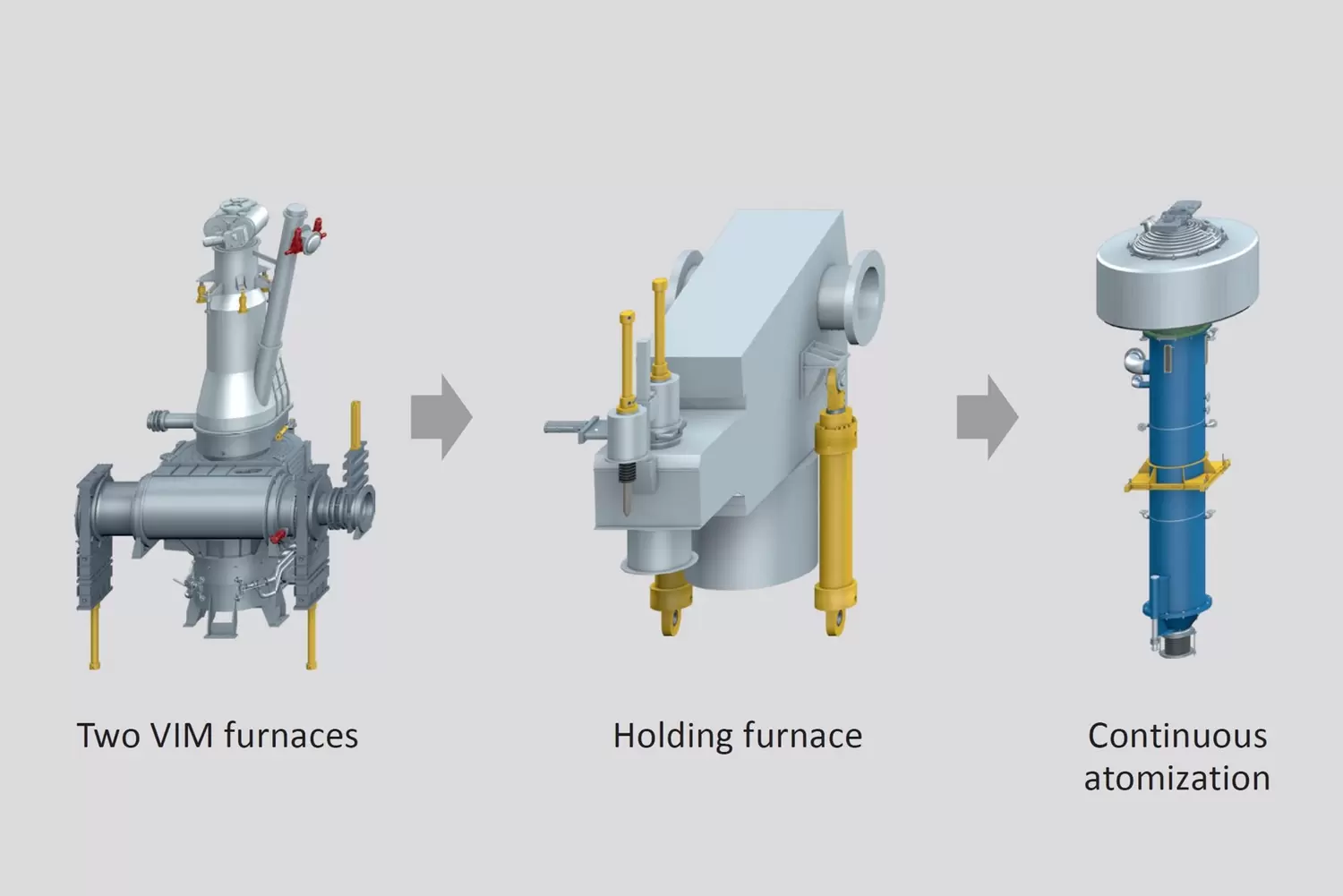In our new developed continuous production prozess, two large vacuum induction melting (VIM) furnaces continuously hold liquid melt, which is atomized successively through the nozzle. The nozzles can be exchanged during operation. Melting is run under vacuum like in the conventional VIGA process. In addition to the VIM route, where pure scrap is used as feedstock, the new process can also work with an existing liquid metal supply. A metallurgical route with basic scrap as feedstock is also possible.