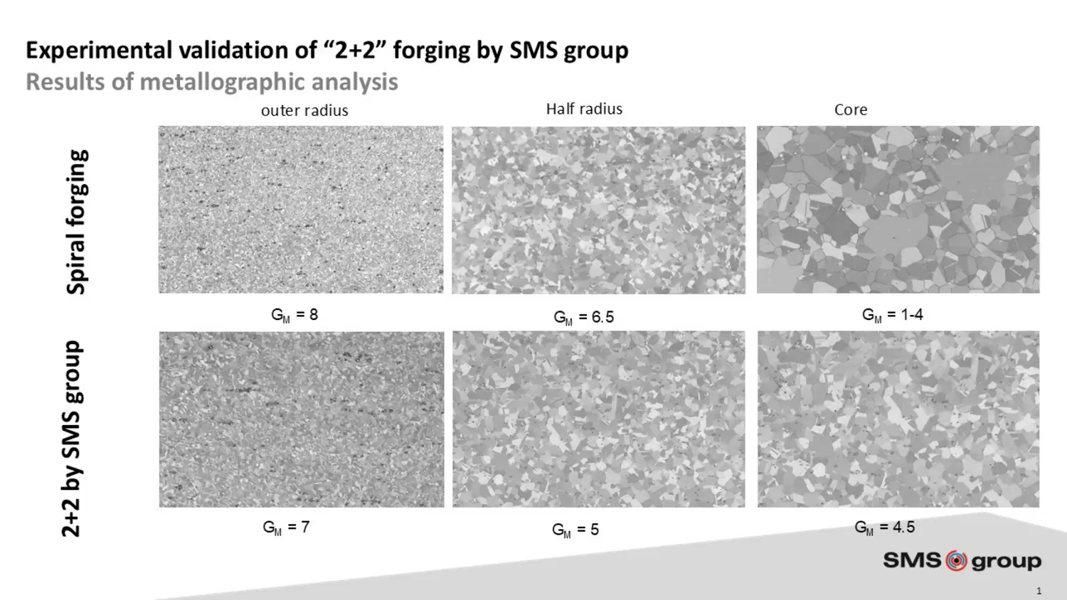 Modern materials such as nickel base superalloys, titanium and high strength steels impose strict demands on forming strategy and process control. Achieving a refined and uniform grain structure is required to ensure increased material quality. While conventional radial and spiral forging methods deliver good results regarding productivity and core deformation, the “2+2 forging” strategy can further optimize these outcomes.
