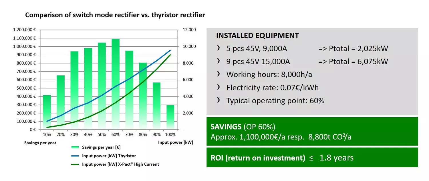 The figure below shows an example of energy savings in an annealing and pickling line for stainless steel, with an electricity price of seven cents/kWh and an operating point of 60 percent of the installed rectifier power. The green bars show the annual potential savings at the corresponding operating point.