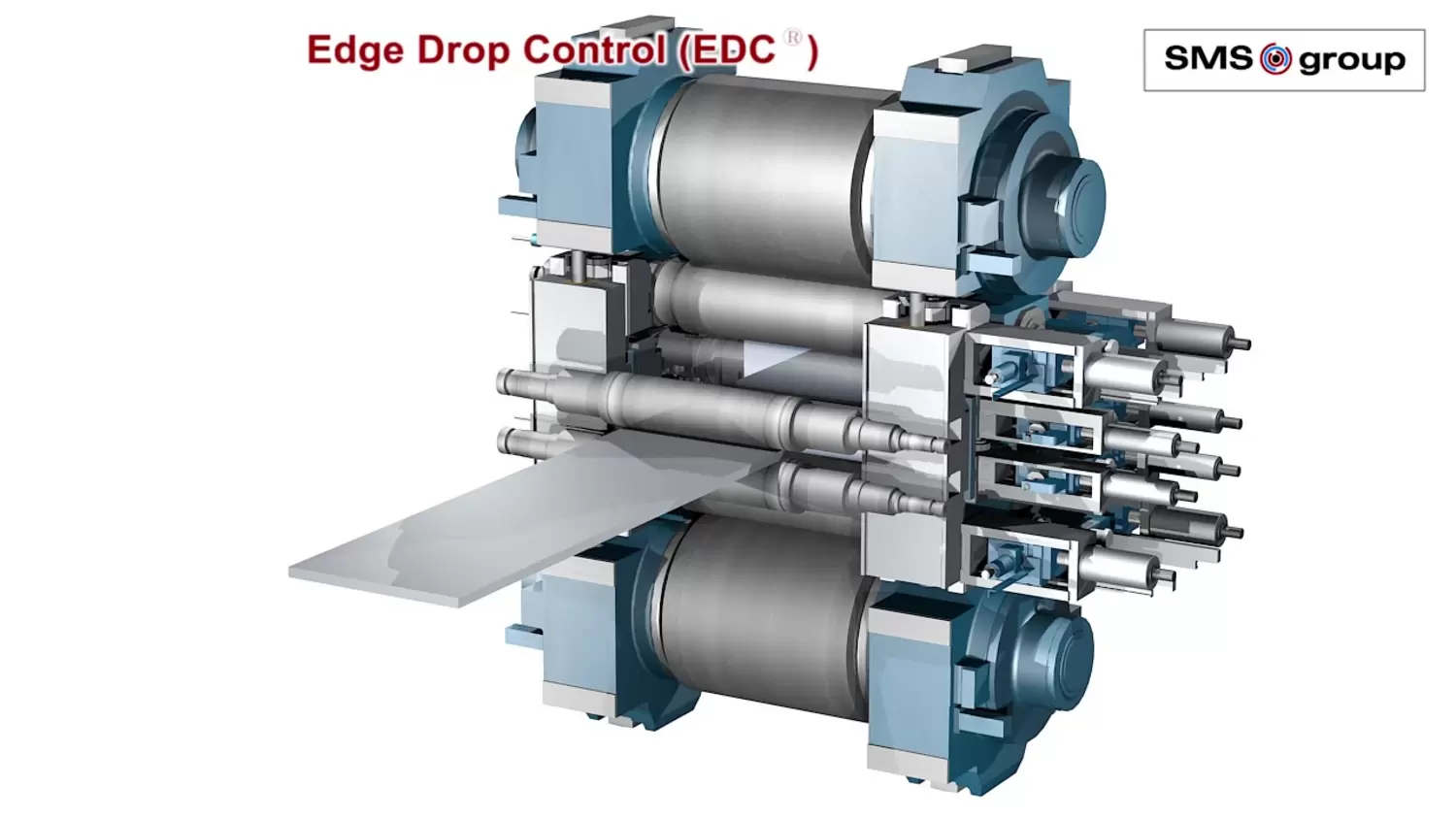 Edge Drop Control (EDC) prevents thickness deviations at the strip edges, caused by variation of the roll flattening. To achieve this, the barrel of each work roll is tapered at one side using a special grind. The control system shifts the taper into the edge of the strip, compensating the edge drop.