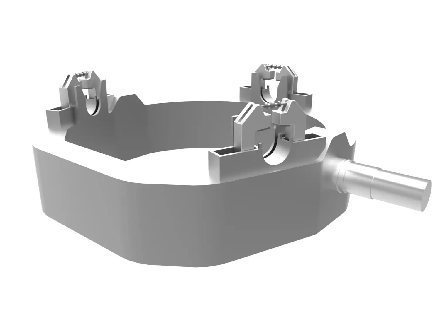 转炉炉壳通过三个夹紧元件固定在转炉托圈上。焊接在容器外壳上的支撑销栓安装在转炉托圈的支撑架上。