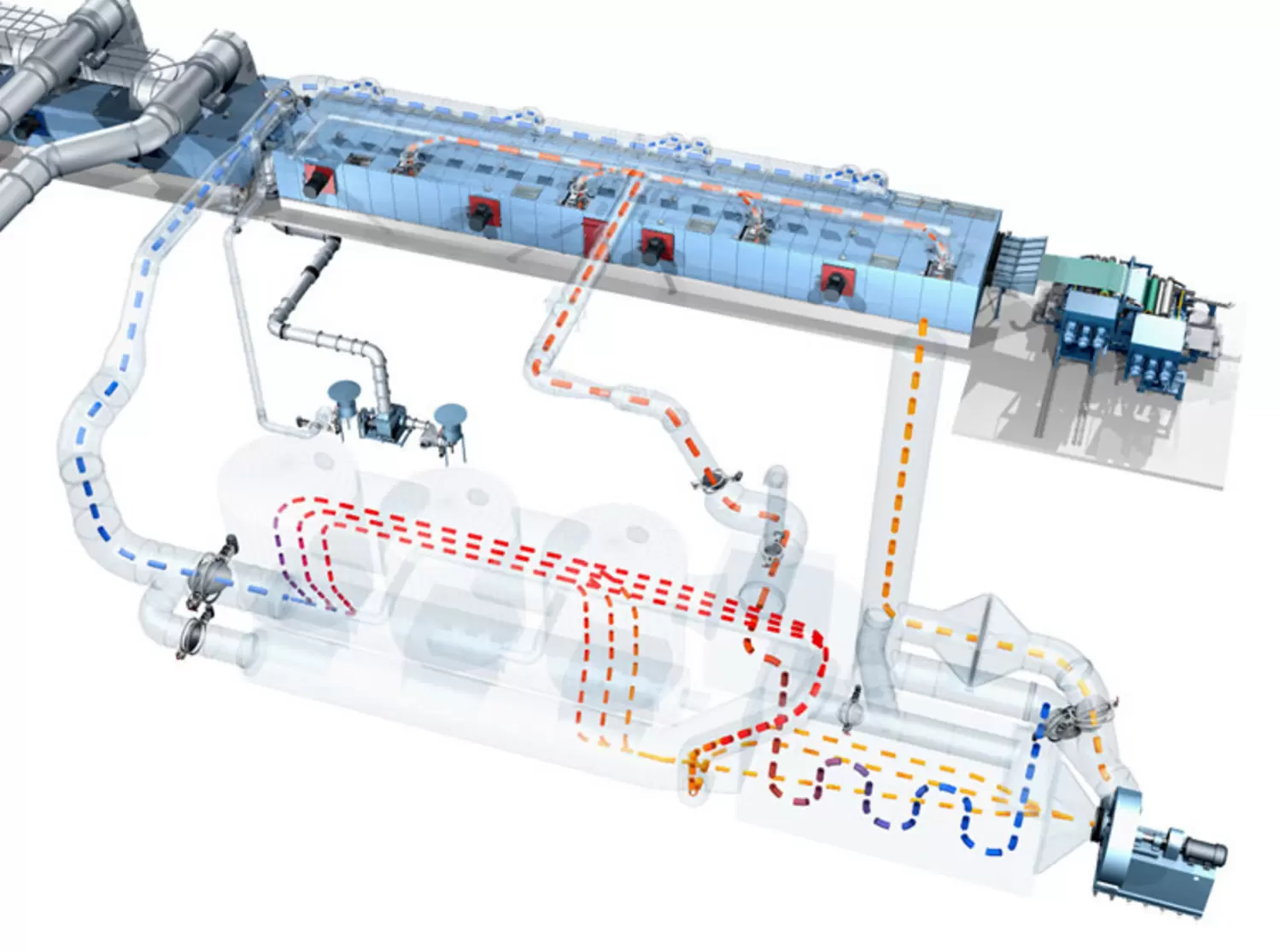 工艺流程从悬垂炉开始,带材在悬垂炉中全长均匀加热。在这里,上下气流分别由各自的变频风机产生。这样就可以分别控制每个炉区所使用的能量。此外,整个气流是根据空气动力学原理设计的,在均匀流动模式的基础上可获得 50% 的热效率。这意味着大量空气在固化炉内以 300 °C 至 400 °C 的温度循环,并将带材加热至所需温度,最高可达 270 °C。一般来说,固化炉的能量来自高效的能量回收系统。该系统由再生燃烧后系统和附加烧嘴组成。