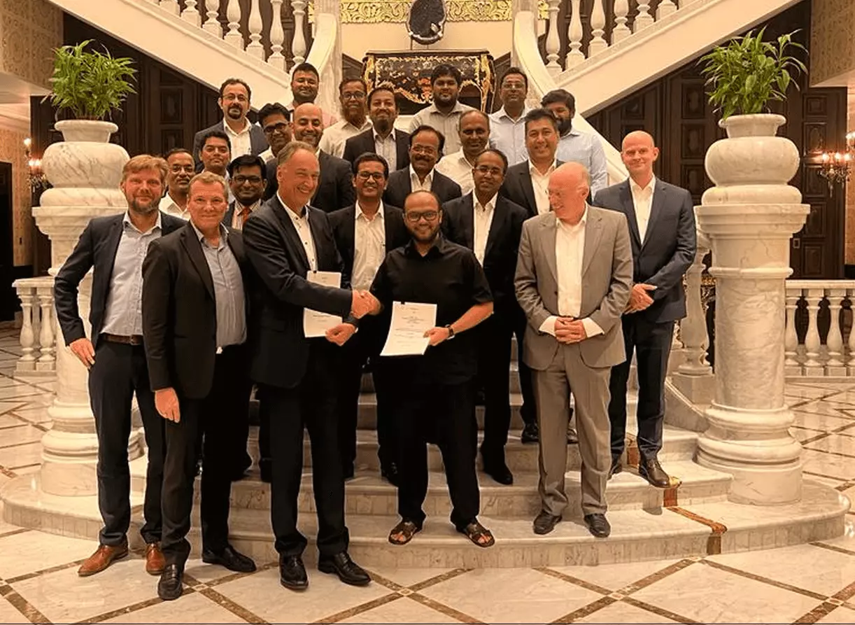 BMSIL 和西马克集团的团队成员在达卡签署合同后合影留念。Bashundhara集团副董事长Safwan Sobhan先生(右)和西马克集团执行董事会主席兼首席执行官Burkhard Dahmen先生握手。